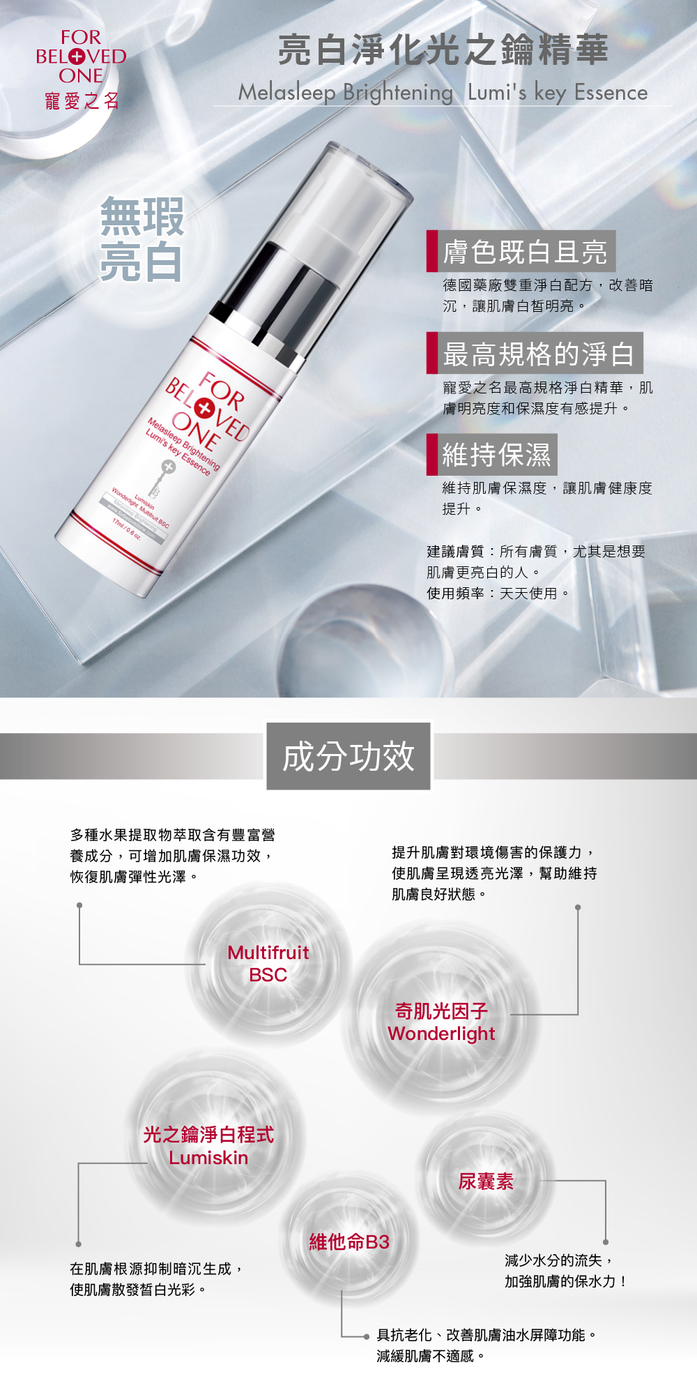 ③Multifruit BSC含多重果酸植萃,深入肌底,完美淨白、無瑕透亮每吋肌膚。
